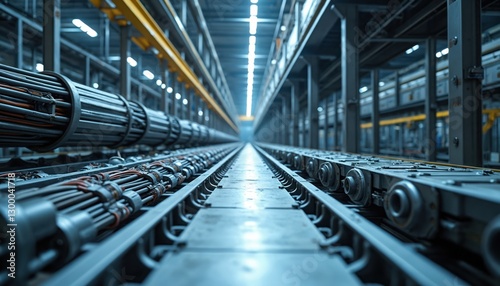 © Vadym, Fototapeta premium Cable tray system carrying neatly arranged electrical cables throughout industrial plant. Connectors running various devices. Ensures safe, organized cable management. Modern solution power, data