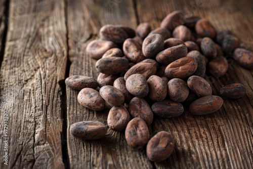 © AHNH3, Naklejka premium Cacao Beans on Wooden Background
