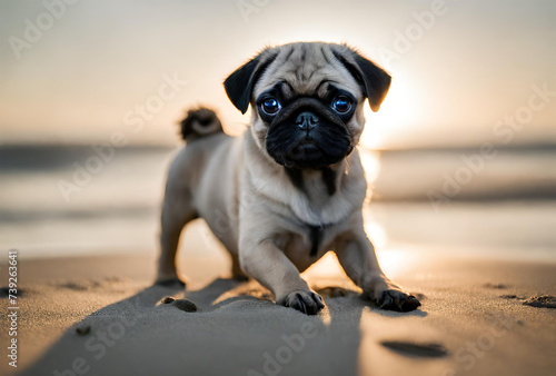 Obraz premium Cachorrinho da raça Pug brincando na praia.