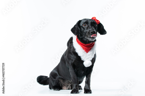 © Leandro, Obraz premium Cachorro preto com fantasia de natal e laço vermelho