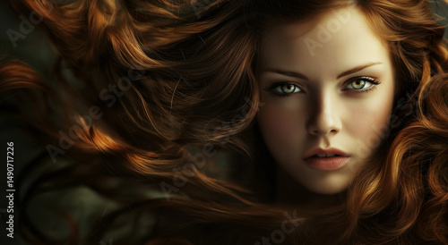 © Vitor, Obraz premium Cachos cativantes: Uma linda mulher com longos e soltos cachos castanhos olha para a câmera com uma intensidade cativante.