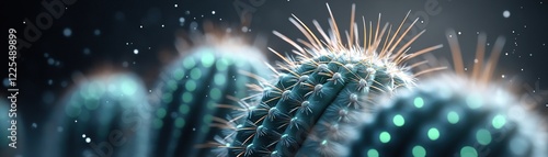 Obraz premium Cacti stand tall in a serene desert, bathed in soft glowing light, creating a mystical atmosphere. The night is filled with a sense of calm and beauty as tiny particles fall gracefully