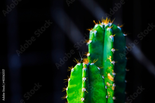 © Supratchai, Naklejka premium Cactus against blurred black shade background.