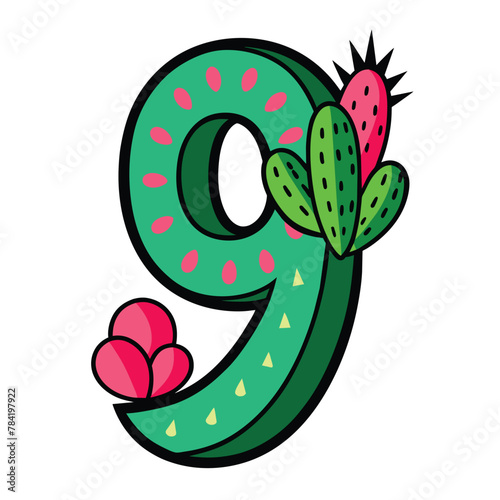 © PixelDreamer, Naklejka premium cactus Alphabet number letter 9 vector on isolated white background