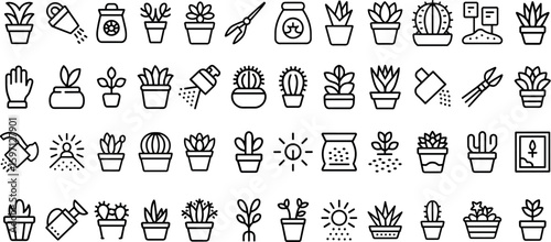 © Vector S J, Naklejka premium cactus care line icons set, popular species. Desert plants, soil more vector illustration