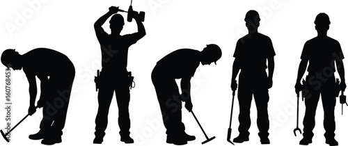 © Creative Crafter, Obraz premium Cad drawing flat vector illustration of construction worker silhouettes holding tools like hammer, drill and wrench in black style