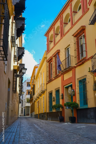© Delia_Suvari, Fototapeta premium 24.05.2023, Cadiz, Spain: Narrow streets of Cadiz with shops, cafes, restaurants and souvenir shops and colorful houses