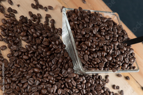 © Luis, Obraz premium Café negro en grano sobre madera y en un recipiente de cristal