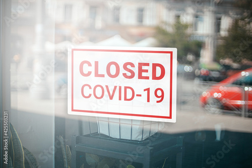 Obraz premium Cafe closed due to COVID-19 coronavirus. Stores, restaurants, offices, other...