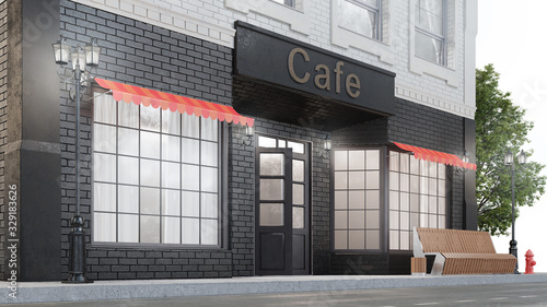 Naklejka premium Cafe or coffee shop. Exterior of a building near the road. The view from the street is a bench with a garbage bin, street lights, hydrant and a beautiful tree, 3d illustration