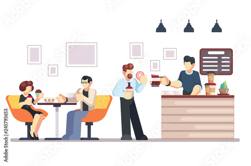 Fototapeta premium Cafe shop and people relaxing. Modern place interior to meet, drink and eat, chat, have a rest, enjoy free time, barista makes and serves coffee for public. Vector flat style cartoon illustration
