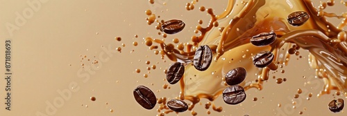 © Michela, Fototapeta premium Caffè e chicchi di caffè spruzzati su sfondo beige