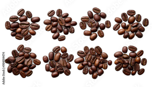 Fototapeta premium Caffè in chicchi dall'alto- Sei manciate di chicchi di caffè disposti su uno sfondo bianco,_1(64)