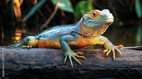 Obraz premium Caiman Lizard basking on a fallen log by Pantanal river, vibrant reptile in sunlight