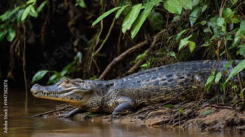 © riverdhan, Naklejka premium Caiman on Riverbank in Amazon Rainforest