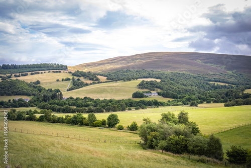 Naklejka premium cairngorm mountains, cottage, heather, speyside, spey, scotland, uk, cottage, hills,