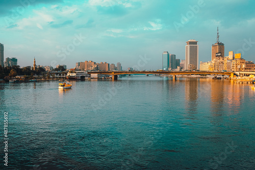 © Antonio, Naklejka premium Cairo Egypt December 2021 View of the amazing Nile river at sunrise, boats anchored on the shores. Bright blue river and sky colors. Skyscrappers in the distance