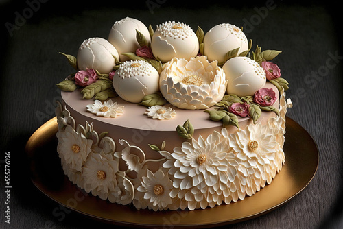 © The 2R Artificiality, Fototapeta premium cake for a birthday with cream. lovely cream flowers. The Malaysian approach. Generative AI