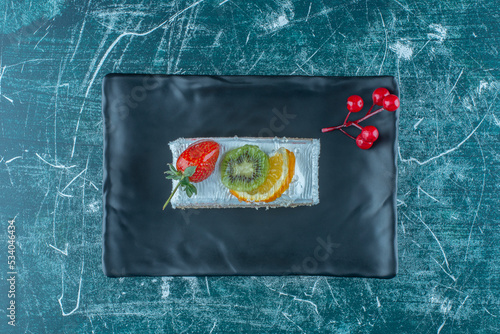 Obraz premium Cake slice with fruit topping on a platter on blue background