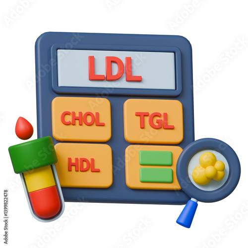 Fototapeta premium Calculated LDL cholesterol concept using Friedewald Equation with calculator showing button labelled cholesterol, triglyceride and HDL. Surrounded by test tube, fat particles on magnifying glass.