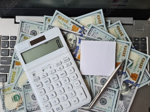 Fototapeta premium Calculator white sticker on one hundred dollar bills on keyboard