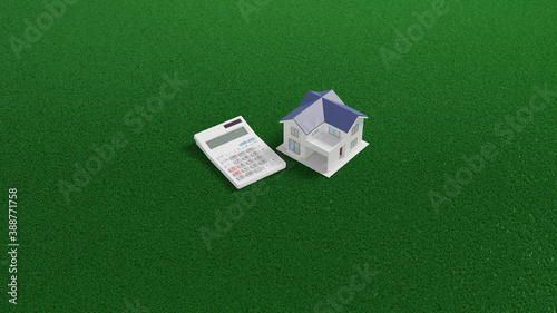 Fototapeta premium Calculator with a toy house placed on a plane.