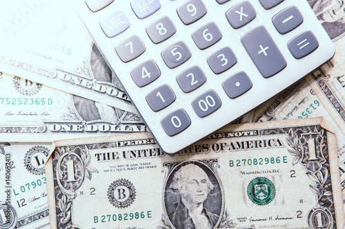 © THANIT, Fototapeta premium Calculator with american dollars on the wooden table background, finance concept