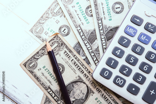 © THANIT, Fototapeta premium Calculator with american dollars on the wooden table background, finance concept