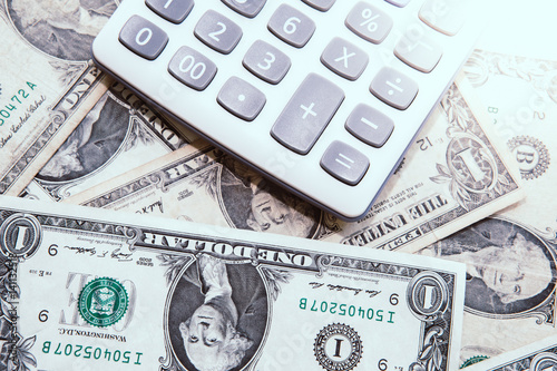 Fototapeta premium Calculator with american dollars on the wooden table background, finance concept