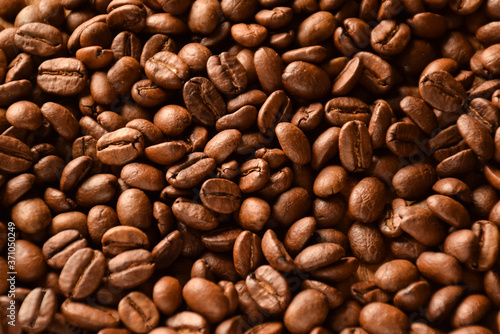 © Serhii, Naklejka premium Całe tło pokrywają duże ziarna kawy