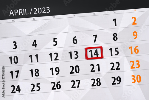 Obraz premium Calendar 2023, deadline, day, month, page, organizer, date, april, friday, number 14