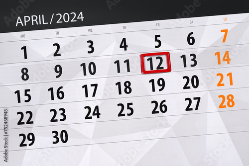 Obraz premium Calendar 2024, deadline, day, month, page, organizer, date, April, friday, number 12