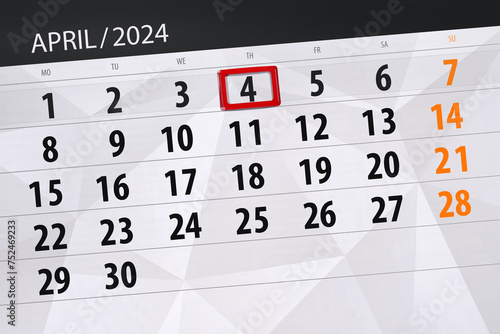 Obraz premium Calendar 2024, deadline, day, month, page, organizer, date, April, thursday, number 4