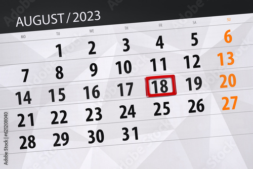 Fototapeta premium Calendar 2023, deadline, day, month, page, organizer, date, August, friday, number 18