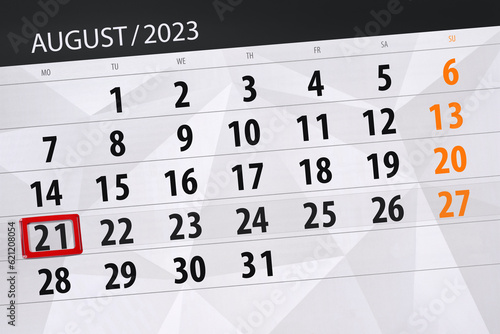 Obraz premium Calendar 2023, deadline, day, month, page, organizer, date, August, monday, number 21