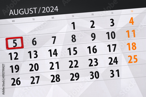 Obraz premium Calendar 2024, deadline, day, month, page, organizer, date, August, monday, number 5