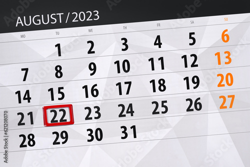 Obraz premium Calendar 2023, deadline, day, month, page, organizer, date, August, tuesday, number 22