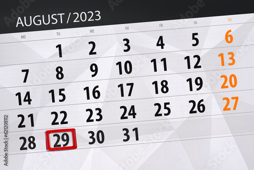 Obraz premium Calendar 2023, deadline, day, month, page, organizer, date, August, tuesday, number 29
