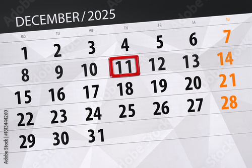 Fototapeta premium Calendar 2025, deadline, day, month, page, organizer, date, December, thursday, number 11
