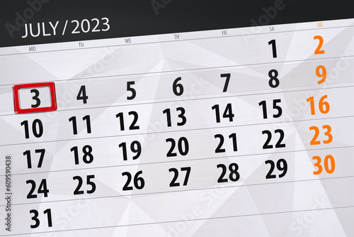 © aleksandrbs, Fototapeta premium Calendar 2023, deadline, day, month, page, organizer, date, July, monday, number 3