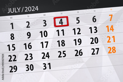 Obraz premium Calendar 2024, deadline, day, month, page, organizer, date, July, thursday, number 4