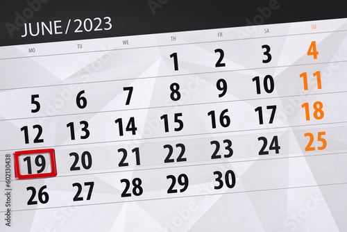 Obraz premium Calendar 2023, deadline, day, month, page, organizer, date, June, monday, number 19