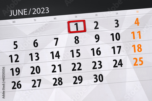 Obraz premium Calendar 2023, deadline, day, month, page, organizer, date, June, thursday, number 1
