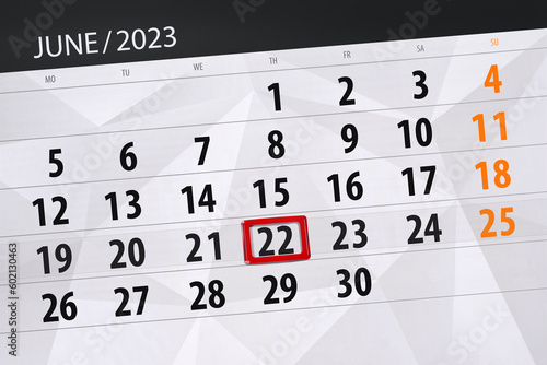 Obraz premium Calendar 2023, deadline, day, month, page, organizer, date, June, thursday, number 22