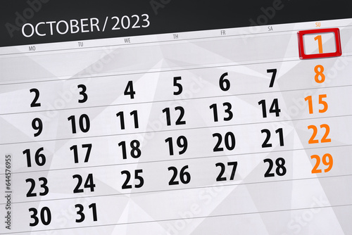 Obraz premium Calendar 2023, deadline, day, month, page, organizer, date, October, sunday, number 1