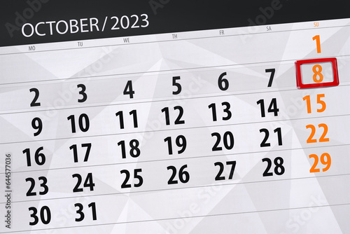Obraz premium Calendar 2023, deadline, day, month, page, organizer, date, October, sunday, number 8