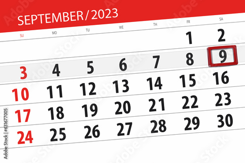Obraz premium Calendar 2023, deadline, day, month, page, organizer, date, September, saturday, number 9