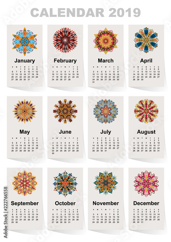 © sebos, Fototapeta premium Calendar for 2019 year. Vintage decorative mandala elements. Week starts on sunday. Vintage style template for your design.