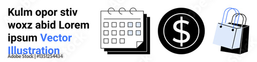 Obraz premium Calendar icon for scheduling, dollar sign for finance, and shopping bag for retail. Ideal for business, planning, finance, shopping, marketing e-commerce and budgeting. Flat landing page banner