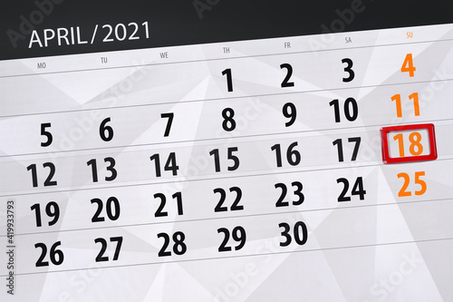 Fototapeta premium Calendar planner for the month April 2021, deadline day, 18, sunday